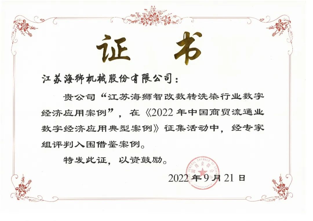 海獅機械智改數(shù)轉(zhuǎn)洗染行業(yè)數(shù)字經(jīng)濟應(yīng)用案例入圍中國商業(yè)聯(lián)合會《2022 年中國商貿(mào)流通業(yè)數(shù)字經(jīng)濟應(yīng)用典型案例》